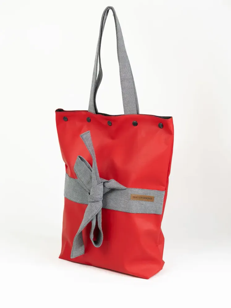 Bike torba izrađena je od eko kože i kombinacije ostalih materijala. Sastoji se od ručaka za nošenje u jednoj ruci te od vezica pomoću kojih je torbu moguće zavezati na volan bicikla.