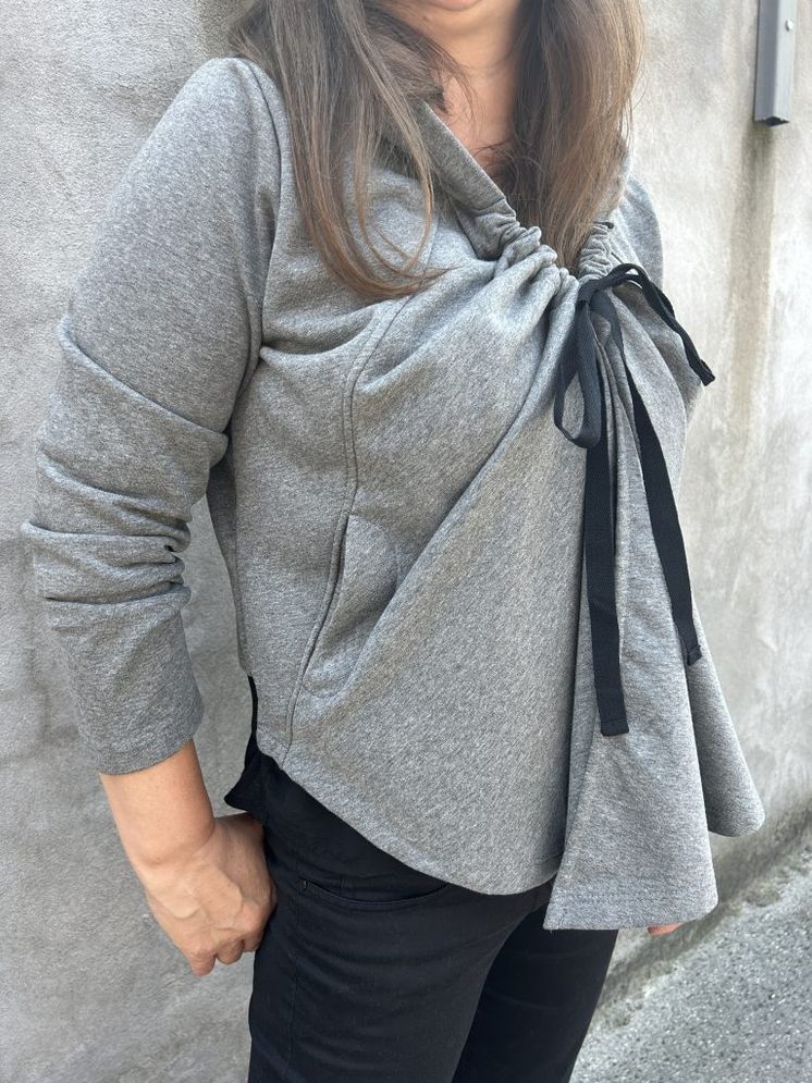 Hoodie Daya donosi svjež i sofisticiran zaokret klasičnoj hudici. Asimetričnog je kroja – prednji dio je duži, stražnji kraći – i veže se na mašnu vezicama na potezanje, što omogućuje stvaranje laganog nabora.