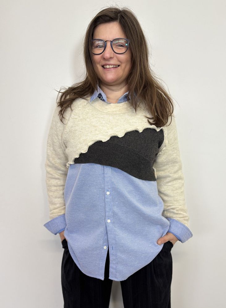 Košulja je nastala procesom upcyclinga postojeće muške košulje koja je nekome bila višak, s dodatkom unikatnog bolera. Može se nositi i bez bolera. Veličina: 36-40