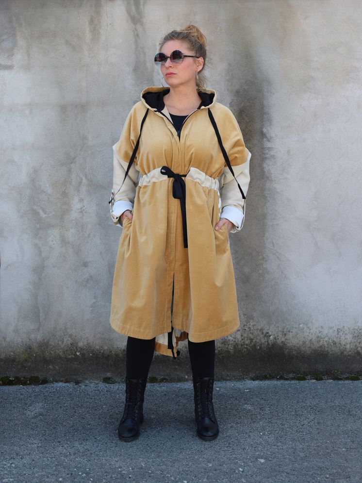 Dolazi u dvije veličine, s krojem koji se lako prilagođava različitim oblicima tijela. Parka ima zatvarač i vezice za podešavanje u struku, a pomoću trakica s prednje i stražnje strane moguće je oblikovati nabor prema želji. Funkcionalna, udobna i održiva – idealna za sve koji žele nositi odgovornu modu s karakterom.