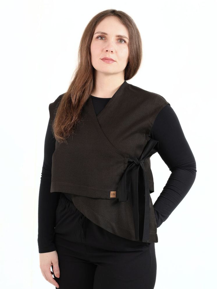 Ovaj zero waste praktičan i stilski prsluk izrađen je od reslova iz proizvodnje i nosiv je na više načina. Veže se u struku, čime se lako prilagođava obliku tijela i outfitu. Nosite ga: preko košulje za poslovni izgled, uz kratku ili dugu majicu za ležernu varijantu ili samostalno ljeti – kao efektan top. Raspon veličina: S-L