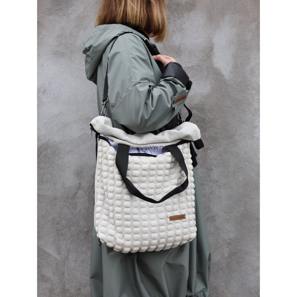 ECOVENTURE je višenamjenski ruksak izrađen u Humani Novoj od prenamijenjenih i čvrstih materijala. Zahvaljujući metalnim drukerima, gornji dio se može zarolati i zakopčati, mijenjajući oblik i volumen. Podesive naramenice, praktični džepovi (uključujući skriveni leđni i unutarnji džep s kopčom za ključeve) čine ga savršenim za organizaciju u pokretu. Kada se skinu naramenice, ECOVENTURE postaje torba – nosiva u ruci, na ramenu ili preko tijela. Svaki primjerak je jedinstven.