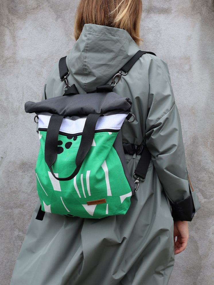 ECOVENTURE je višenamjenski ruksak izrađen u Humani Novoj od prenamijenjenih i čvrstih materijala. Zahvaljujući metalnim drukerima, gornji dio se može zarolati i zakopčati, mijenjajući oblik i volumen. Podesive naramenice, praktični džepovi (uključujući skriveni leđni i unutarnji džep s kopčom za ključeve) čine ga savršenim za organizaciju u pokretu. Kada se skinu naramenice, ECOVENTURE postaje torba – nosiva u ruci, na ramenu ili preko tijela. Svaki primjerak je jedinstven.